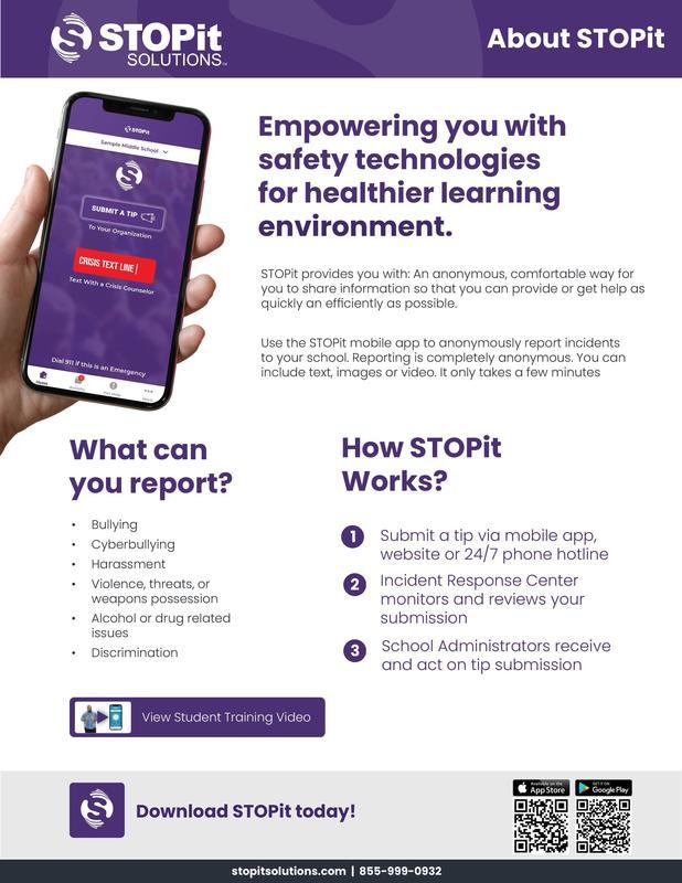 We would like to share a resource with you - STOPit provides you with an anonymous, comfortable way for you to share information so that you can provide or get help as quickly and efficiently as possible.